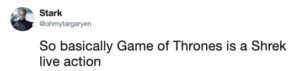somebody-compared-game-of-thrones-to-shrek-and-the-similarity-is-uncanny-1 May 26, 2019, 2:08 am Leave a Reply Cancel replyYou must be logged in to post a comment. Loading… 0 See more Previous article Somebody Compared ‘Game Of Thrones’ To ‘Shrek’ And The Similarity Is Uncanny